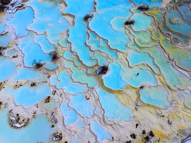 大柴旦翡翠湖位于青海省海西蒙古族藏族自治州大柴旦镇,原是大柴旦化工厂盐湖采矿队采矿区。由于矿石所含矿物质浓度不同和天气变化,湖水呈现出深蓝、翠绿、黄色等多彩颜色,犹如一颗颗镶嵌在大地上的翡翠。
