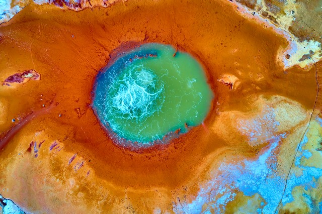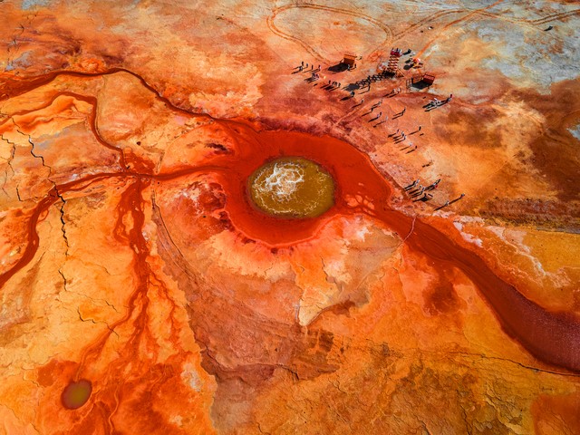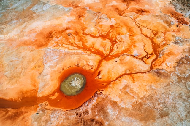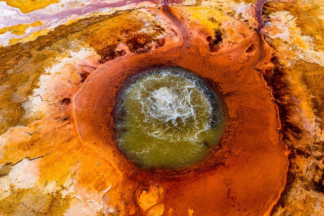 艾肯泉位于青海省海西蒙古族藏族自治州茫崖市花土沟镇莫合尔布鲁克村,被称为“大地之眼”或“恶魔之眼”。这是一个地热喷泉,泉眼周围由硫磺等矿物质沉积形成红褐色的圆形边界,中心泉水翻滚沸腾,不断向外溢出。