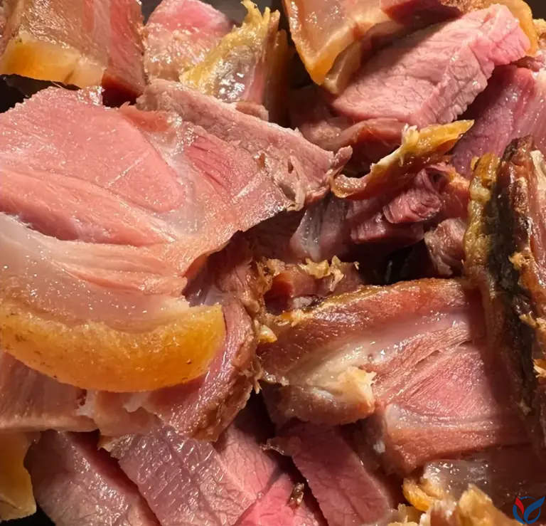 川味腊肉的标签就是麻、辣、烟熏味。它的风味密码,在于腌制时毫不吝啬地投入花椒、辣椒等香料,让麻辣的底味深入骨髓。熏制时,必选用柏树枝和橘皮,点燃后升腾的烟雾,赋予了腊肉一股独特的、沁人心脾的木质香气。入口时,肥肉部分晶莹剔透,油脂在舌尖融化,带着柏木的清香;瘦肉部分则紧实有嚼劲,麻辣过后是悠长的回甘。一盘蒜苗炒腊肉,就是川人最热烈的情感表达。